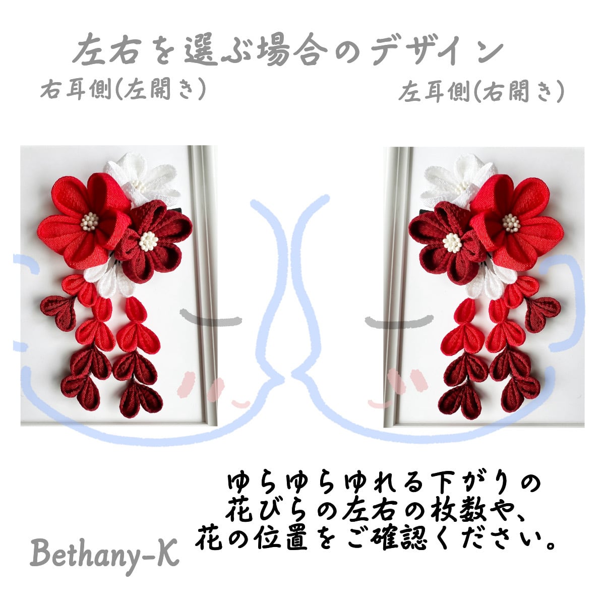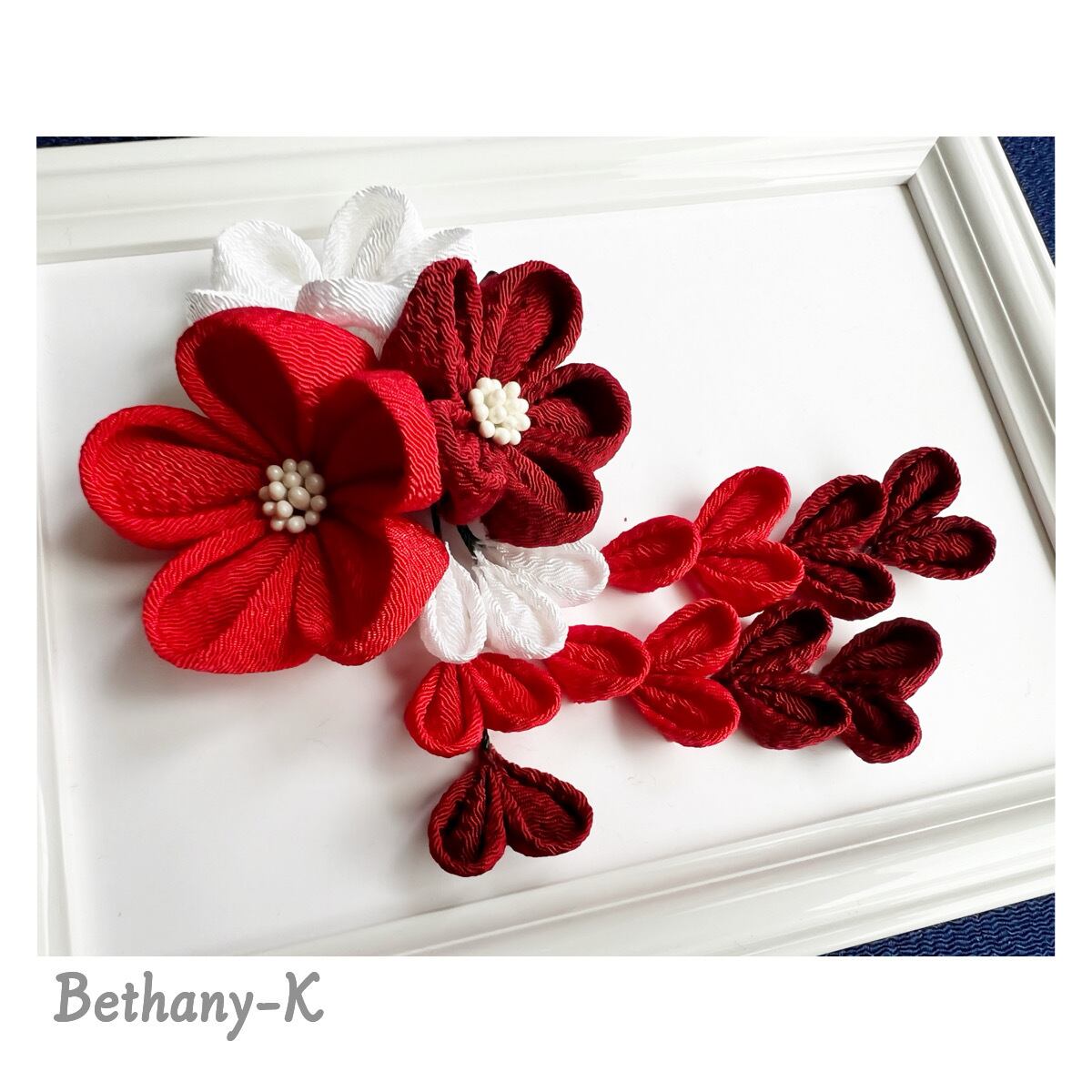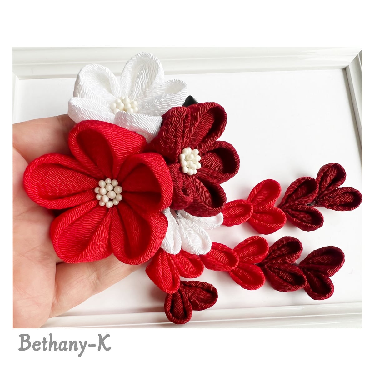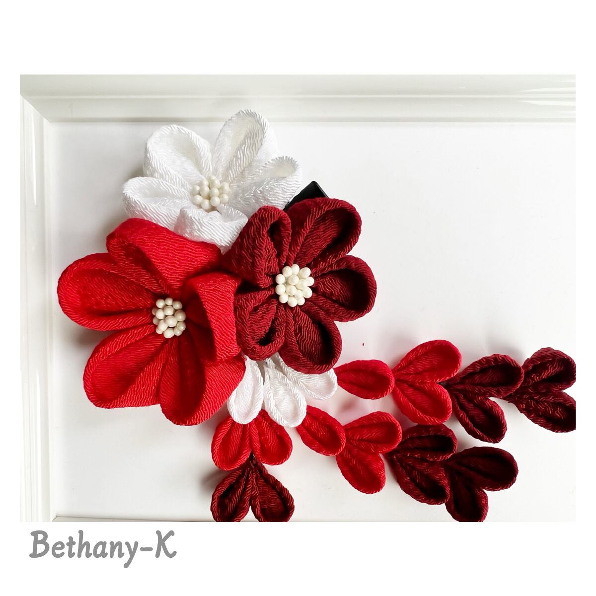 七五三・卒業式に◆大きくて可愛いつまみ細工の髪飾り(下がり付き)◆白×赤×えんじ色のママでも簡単につけられるつまみ細工_BETHANY- KベサニK製作所 | 【Bethany-K(ベサニK)製作所】 つまみ細工&ちりめんリボン