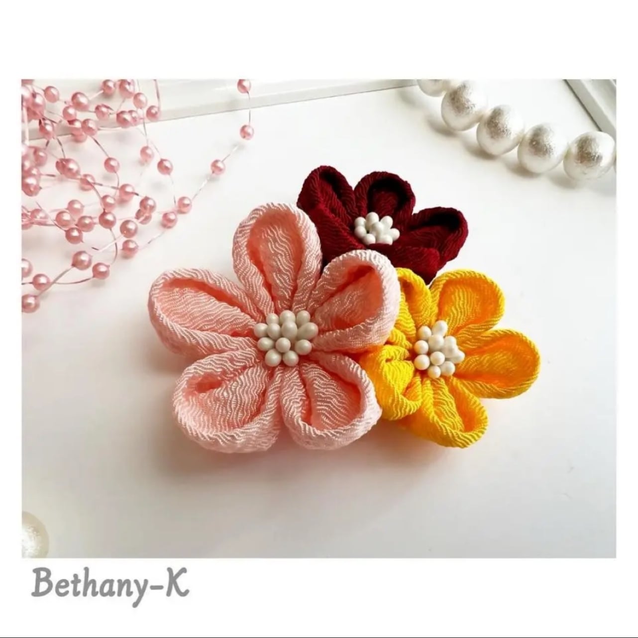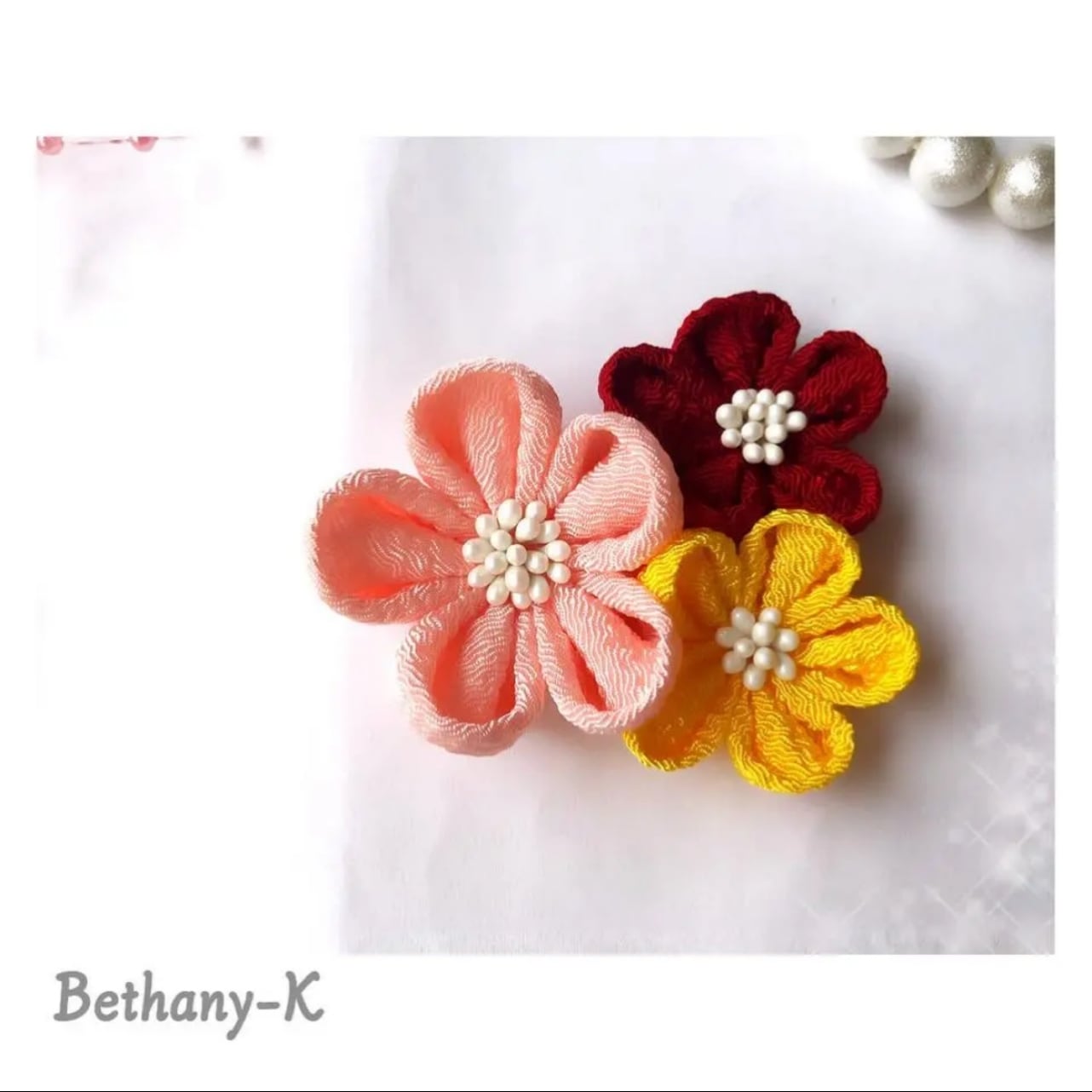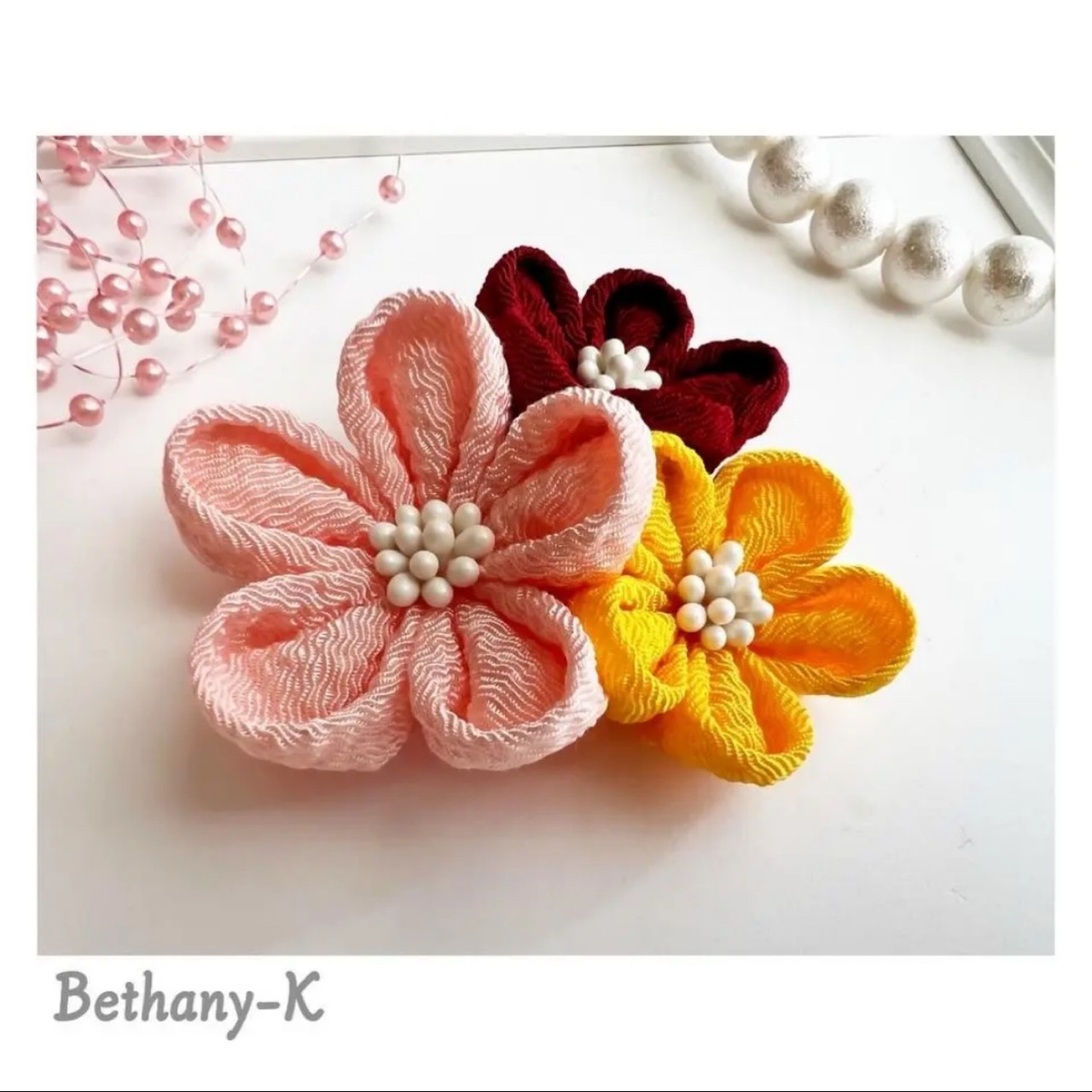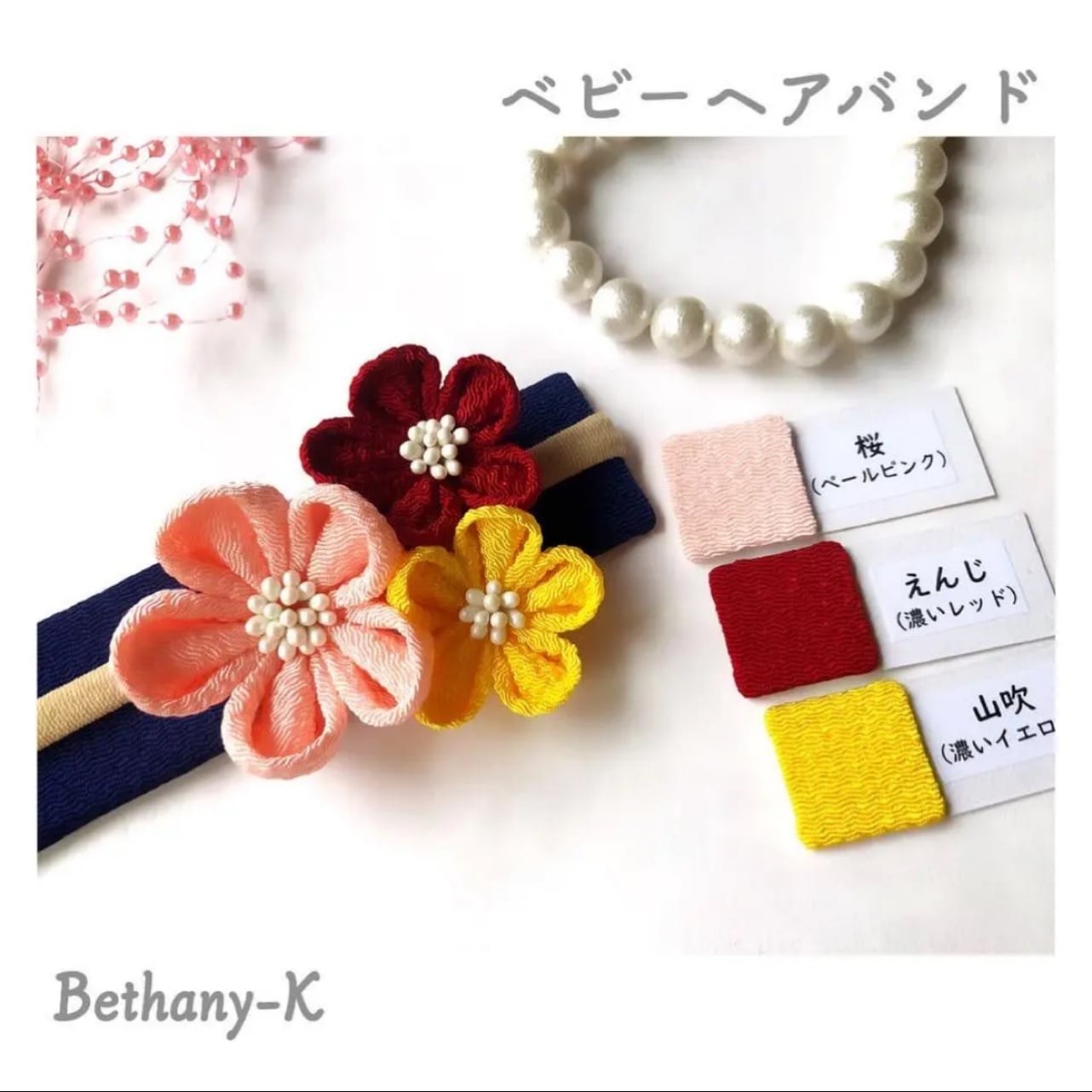 お食い初めや初節句に◆小花が可愛い和モダン髪飾り(下がり無し)◆桜×えんじ×山吹色のママでも簡単につけられるつまみ細工_BETHANY-K ベサニK製作所 | 【Bethany-K(ベサニK)製作所】 つまみ細工&ちりめんリボン