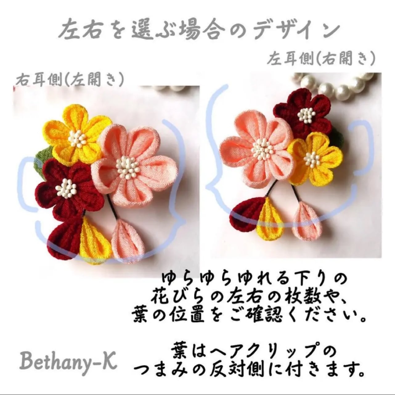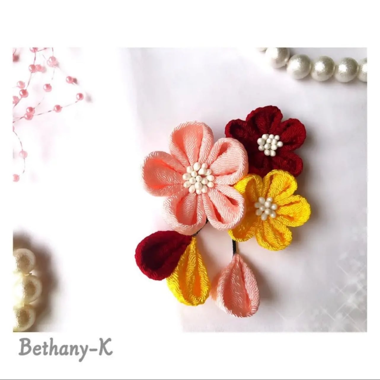 お食い初めや初節句に◆小花が可愛い和モダン髪飾り(下がり付き)◆桜×えんじ×山吹色のママでも簡単につけられるつまみ細工_BETHANY-K ベサニK製作所 | 【Bethany-K(ベサニK)製作所】 つまみ細工&ちりめんリボン