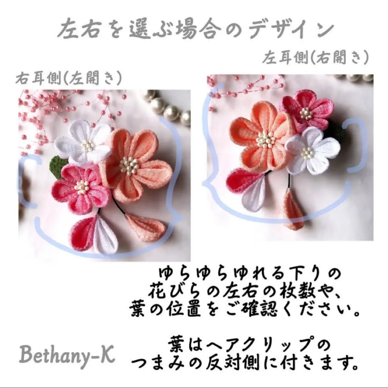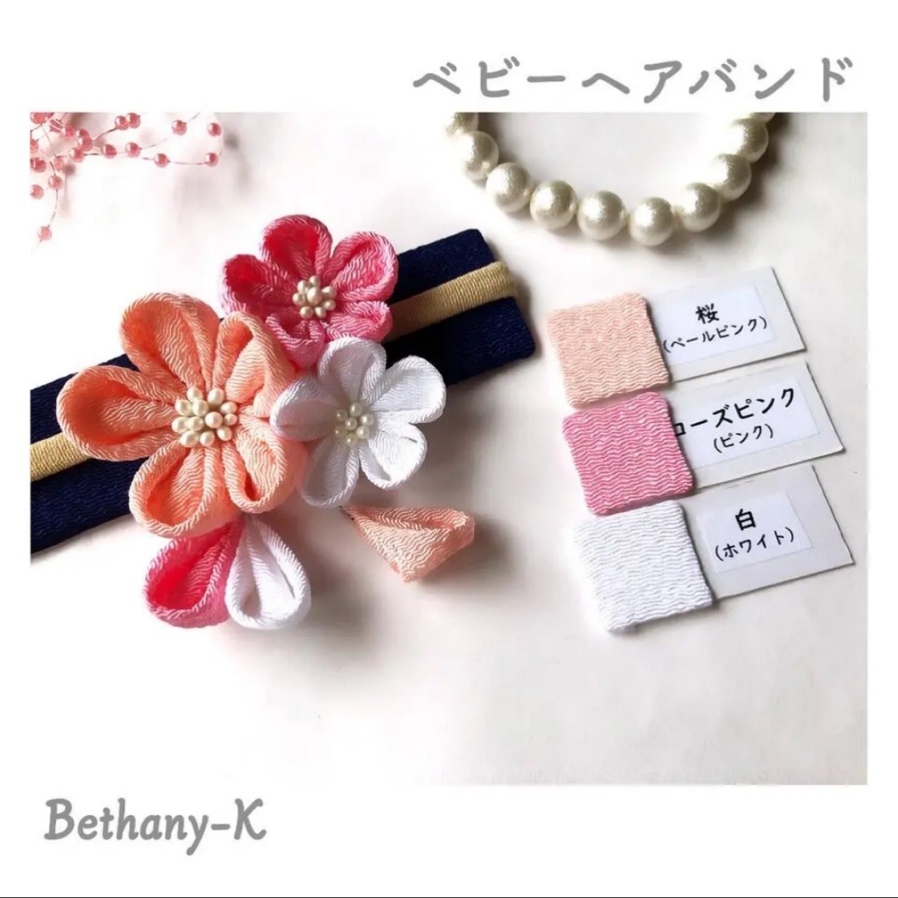 お食い初めや初節句に◆小花が可愛い和モダン髪飾り(下がり付き)◆桜×ローズピンク×白色のママでも簡単につけられるつまみ細工_BETHANY-K ベサニK製作所 | 【Bethany-K(ベサニK)製作所】 つまみ細工&ちりめんリボン
