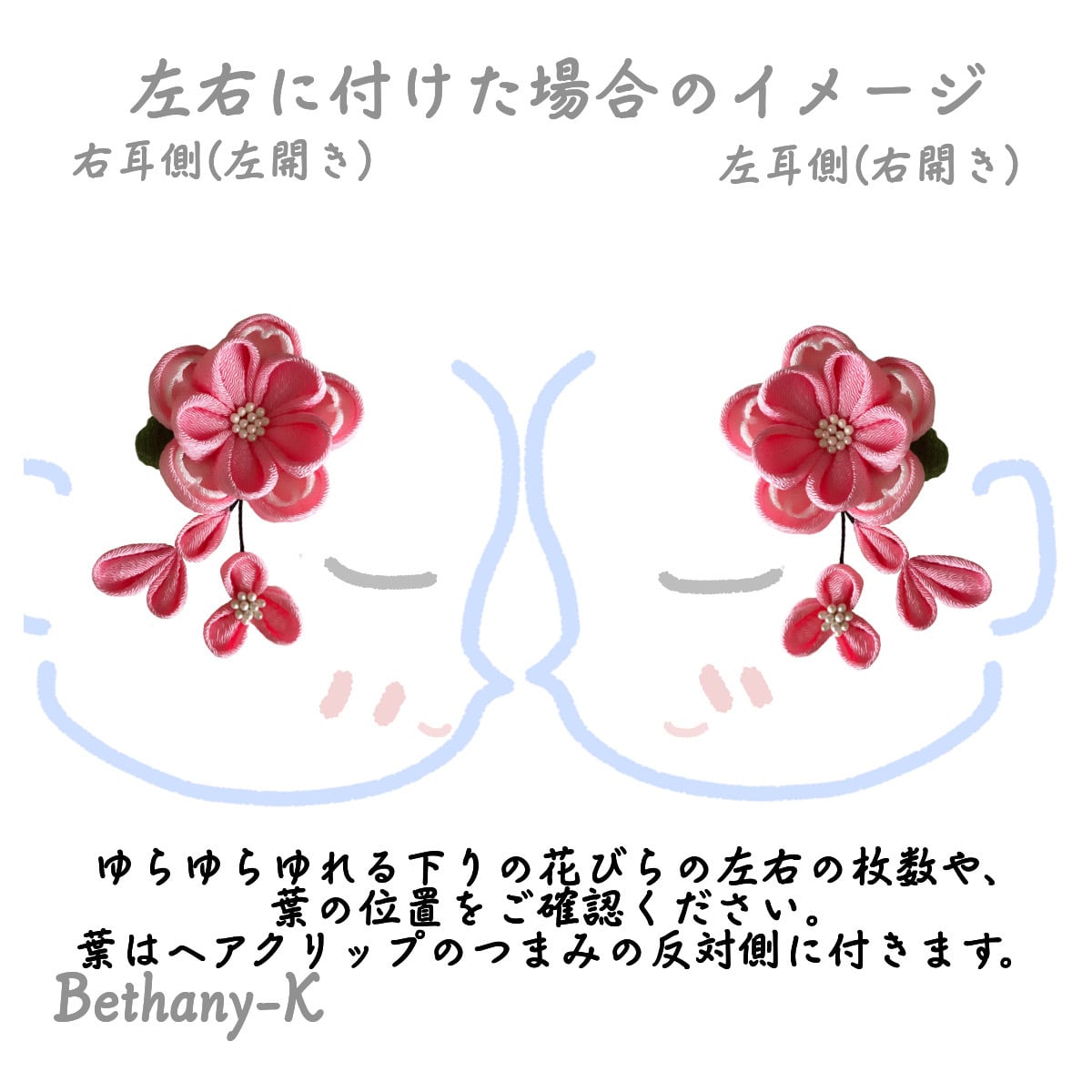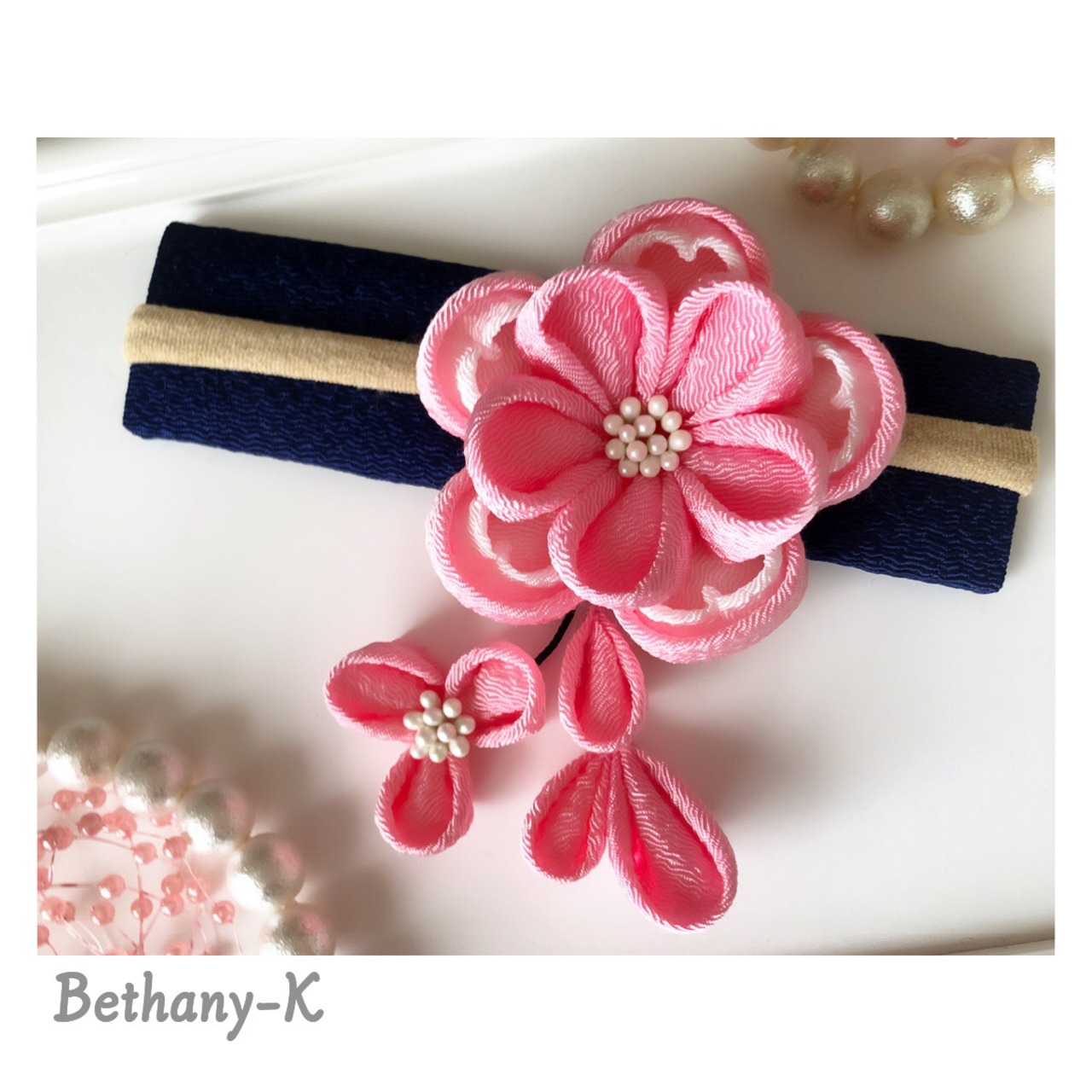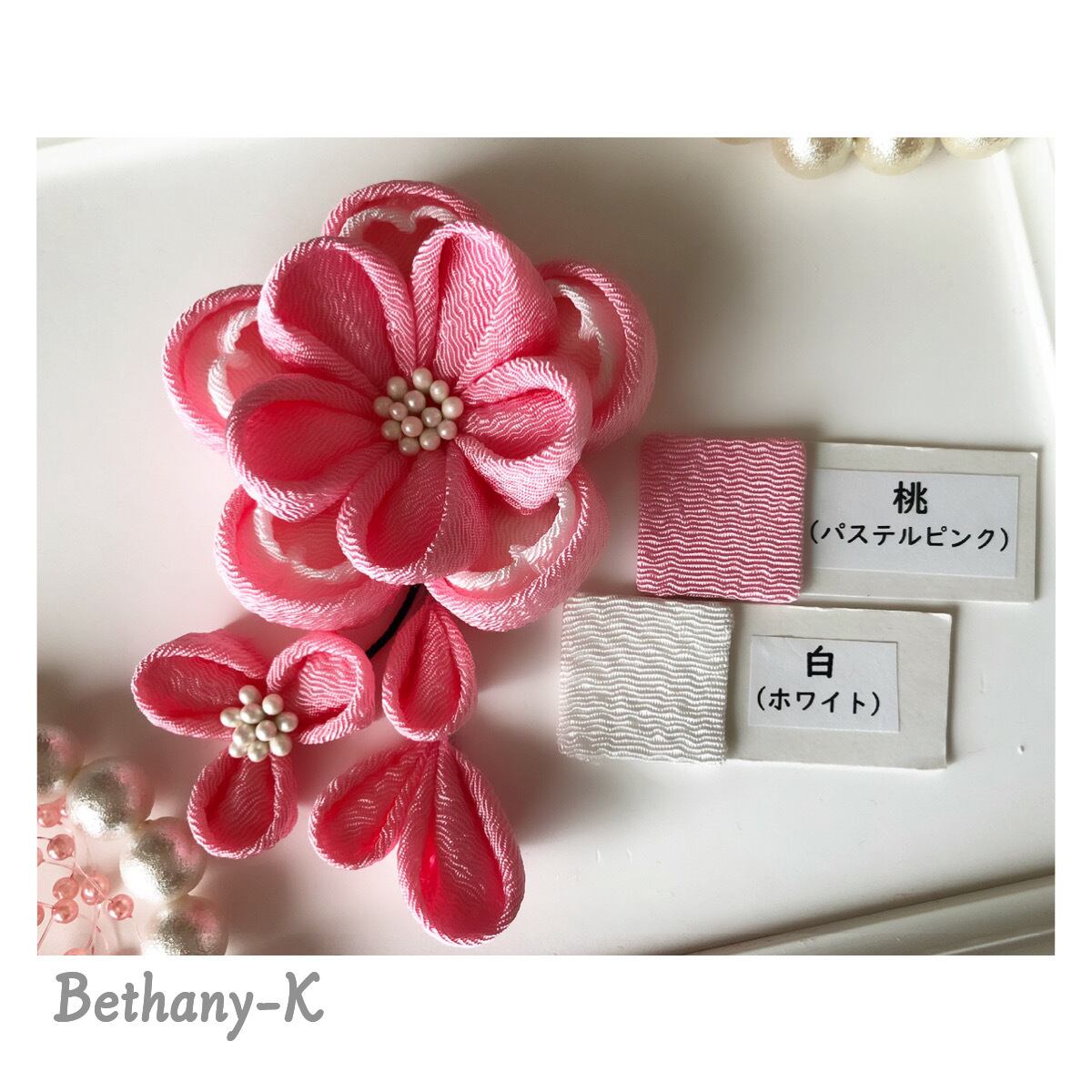 七五三やひな祭りに◆5.5cmキュートな重ね梅の様々な髪飾り(下がり付き)◆桃×白色のママでも簡単につけられるつまみ細工_BETHANY-K ベサニK製作所 | 【Bethany-K(ベサニK)製作所】 つまみ細工&ちりめんリボン