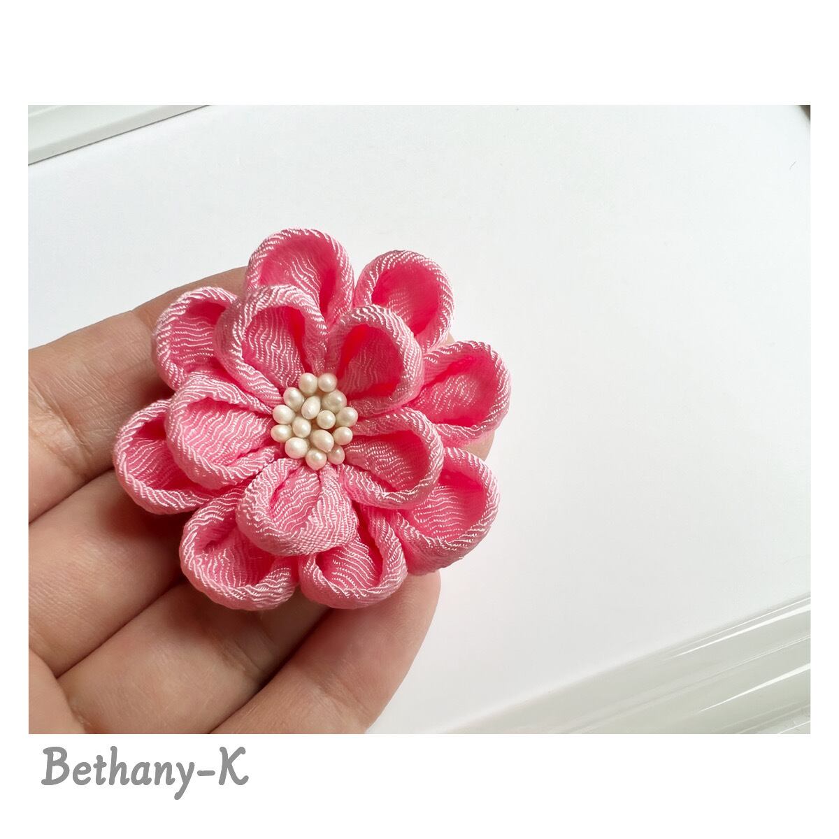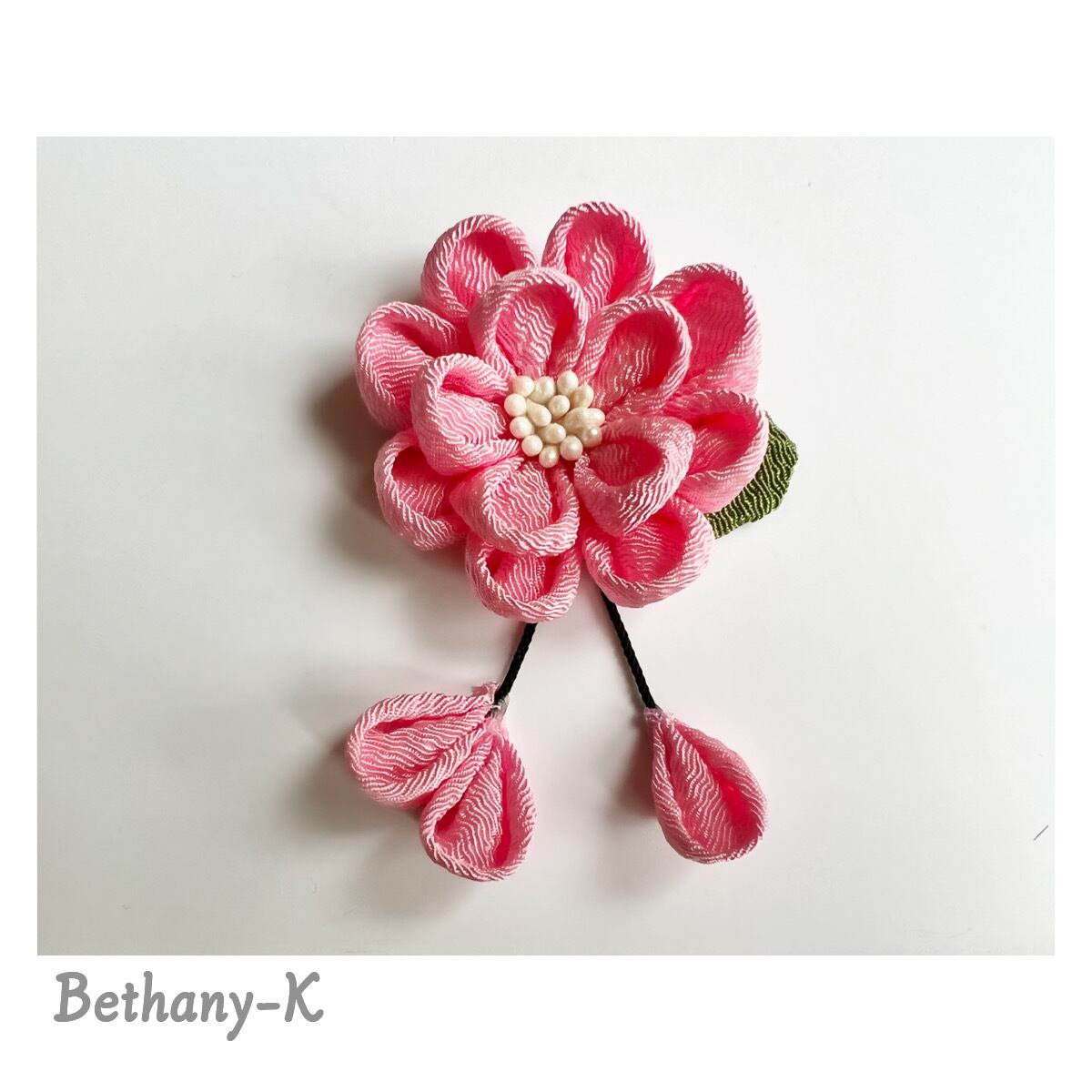 初節句・お食い初めに人気!◆4.5cmカメリア髪飾り(下がり付き)◆桃色のママでも簡単につけられるつまみ細工_BETHANY- KベサニK製作所 | 【Bethany-K(ベサニK)製作所】 つまみ細工&ちりめんリボン