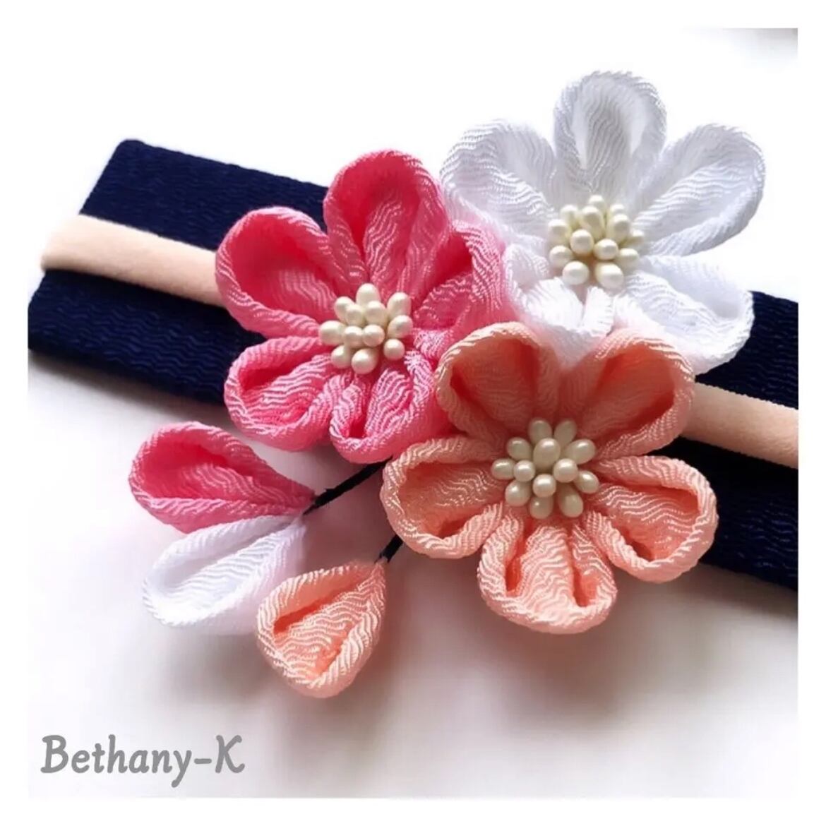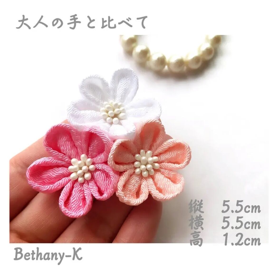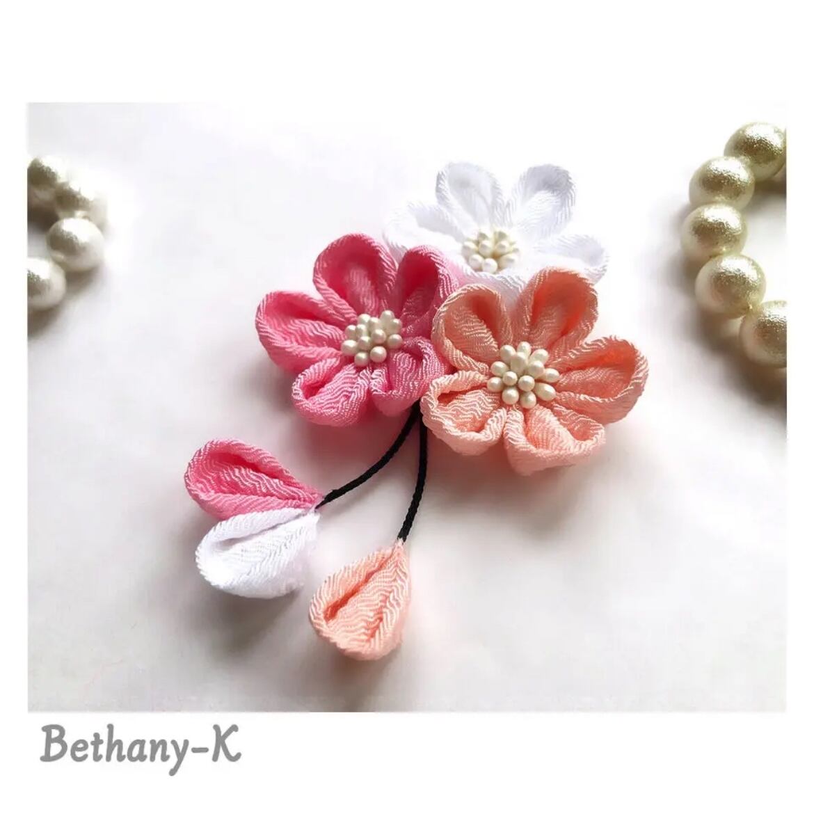 お食い初めや初節句に≪小花が可愛い和モダン髪飾りミニ(下がり付き)≫ローズピンク×桜×白色のママでも簡単につけられるつまみ細工_BETHANY- KベサニK製作所 | 【Bethany-K(ベサニK)製作所】 つまみ細工&ちりめんリボン