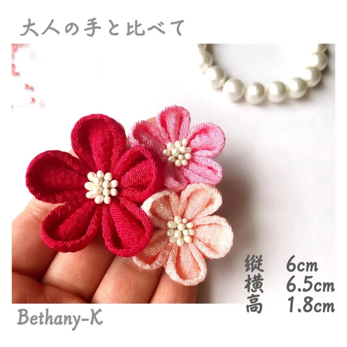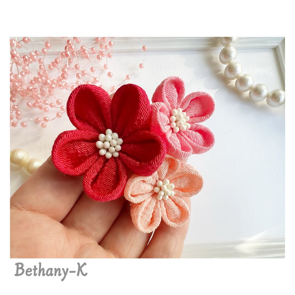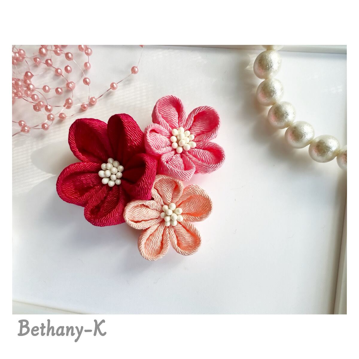 お食い初めや初節句に◆小花が可愛い和モダン髪飾り(下がり無し)◆梅×ローズピンク×桜色のママでも簡単につけられるつまみ細工_BETHANY- KベサニK製作所 | 【Bethany-K(ベサニK)製作所】 つまみ細工&ちりめんリボン