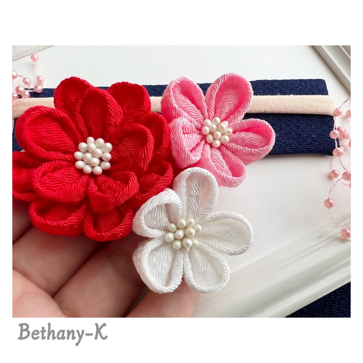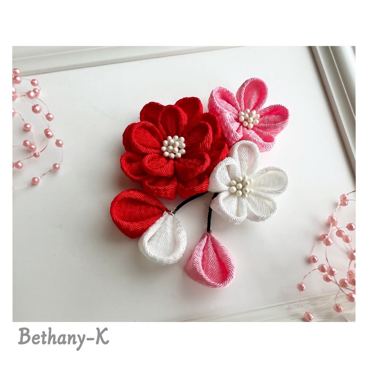お食い初めや七五三に◆4.5cmカメリアの可愛い和モダン髪飾り(下がり付き)◆白×桃×赤色のママでも簡単につけられるつまみ細工_BETHANY- KベサニK製作所 | 【Bethany-K(ベサニK)製作所】 つまみ細工&ちりめんリボン