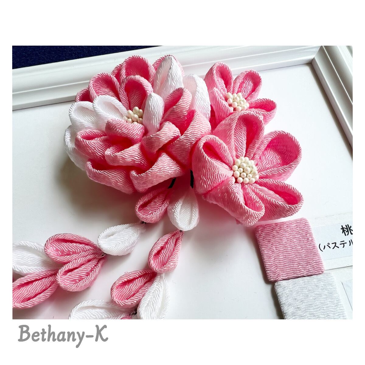 成長のお祝いに◆6cmダリアの華やか髪飾り(下がり付き)◆白×桃色のママでも簡単につけられるつまみ細工_BETHANY- KベサニK製作所 | 【Bethany-K(ベサニK)製作所】 つまみ細工&ちりめんリボン